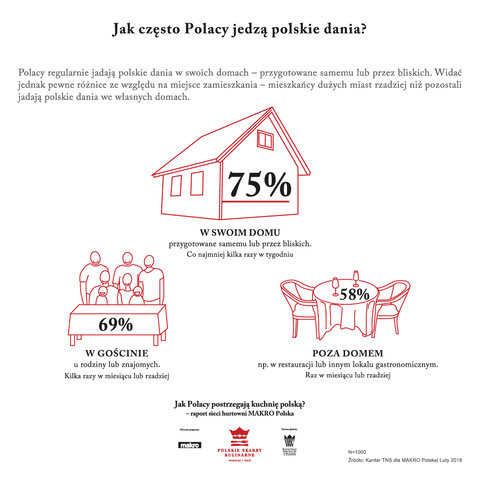 Polacy regularnie jadają polskie dania w swoich domach – przygotowane samodzielnie lub przez bliskich – 75% respondentów jada tak co najmniej kilka razy w tygodniu. Widoczne są jednak pewne różnice ze względu na miejsce zamieszkania – mieszkańcy dużych miast rzadziej niż pozostali jadają polskie dania we własnych domach. W gościnie – u rodziny lub znajomych – jada 69% badanych, kilka razy w miesiącu lub rzadziej. Natomiast poza domem – w restauracji lub innym lokalu gastronomicznym – 58% badanych jada polskie dania raz w miesiącu lub rzadziej.